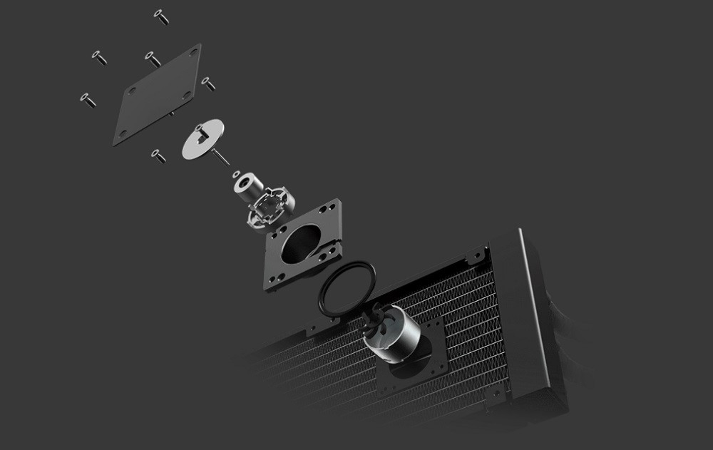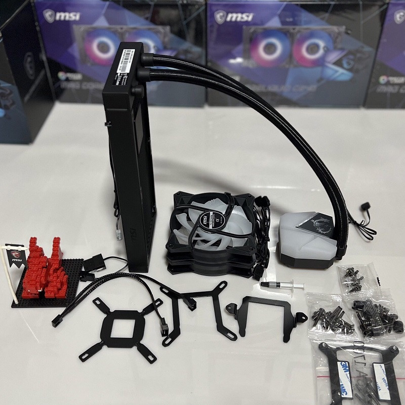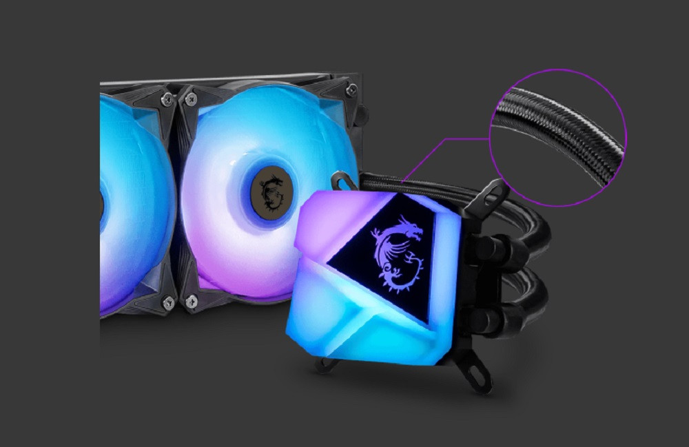Máy bơm đã được tích hợp vào bộ tản nhiệt MSI để giảm âm và giảm tiếng ồn. Ngoài ra, việc đặt máy bơm vào bộ tản nhiệt cũng làm tăng tuổi thọ của máy bơm bằng cách di chuyển nó ra xa nguồn nhiệt.