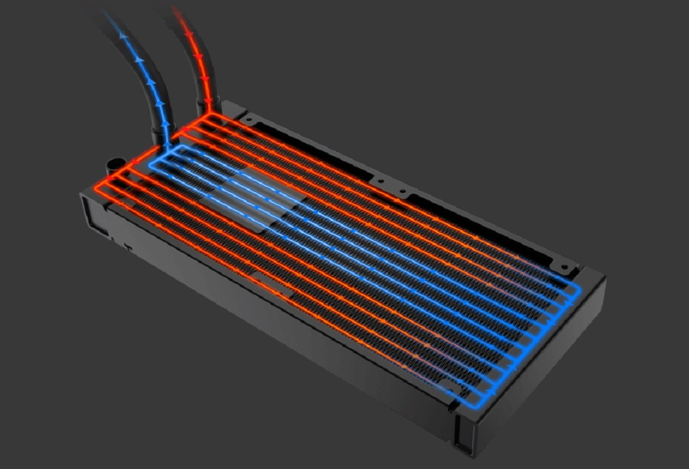 Một đường dẫn phân chia qua bộ tản nhiệt nhanh chóng tản nhiệt, chất lỏng được làm mát sau đó được bơm trở lại vòng lặp.